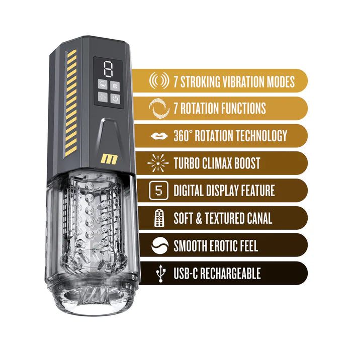 Experience a cyclone of pleasure with the SpinMaster Pro! This automatic male masturbator is built for serious performance and innovation, transcending your play to an elite standard of luxury. Customize your stroking sessions with 7 bold vibration modes and 7 stroking rotation modes with a blend of varying speeds and patterns. 360° full rotation stimulates every inch of your shaft, wrapping you in a vortex of phenomenal mind-blowing sensations. Activate the SpinMaster's turbo climax boost for maximum speed and power, testing your edge and building to an amazing climax. The digital display function tracks your settings on the stroker's front screen, so you can seamlessly operate between modes. The soft and textured inner chamber provides a smooth, realistic feel with a protective case that keeps it clean for long term use. With a USB-C charger included, enjoy up to 60 minutes of power on a full charge, going longer and harder than ever before. Are you ready to handle the storm?